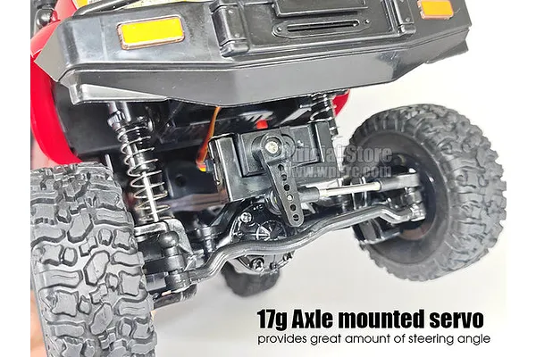 Features a 17g steering servo mounted directly on the axle. This setup helps provide a wide steering angle, crucial for navigating tight spots and obstacles often encountered during rock crawling adventures. Get precise control to place your wheels exactly where you need them on challenging terrain