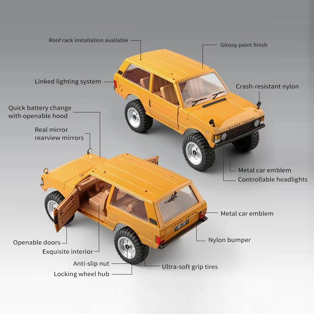 • Realistic Structure: The 1/12 RC Range Rover RC Crawler boasts a realistic design, providing the feel of a real car. Its perfect for flat ground, sandy areas, muddy paths, and grassy fields. Enhance your driving experience with the MN-168s realistic light control.