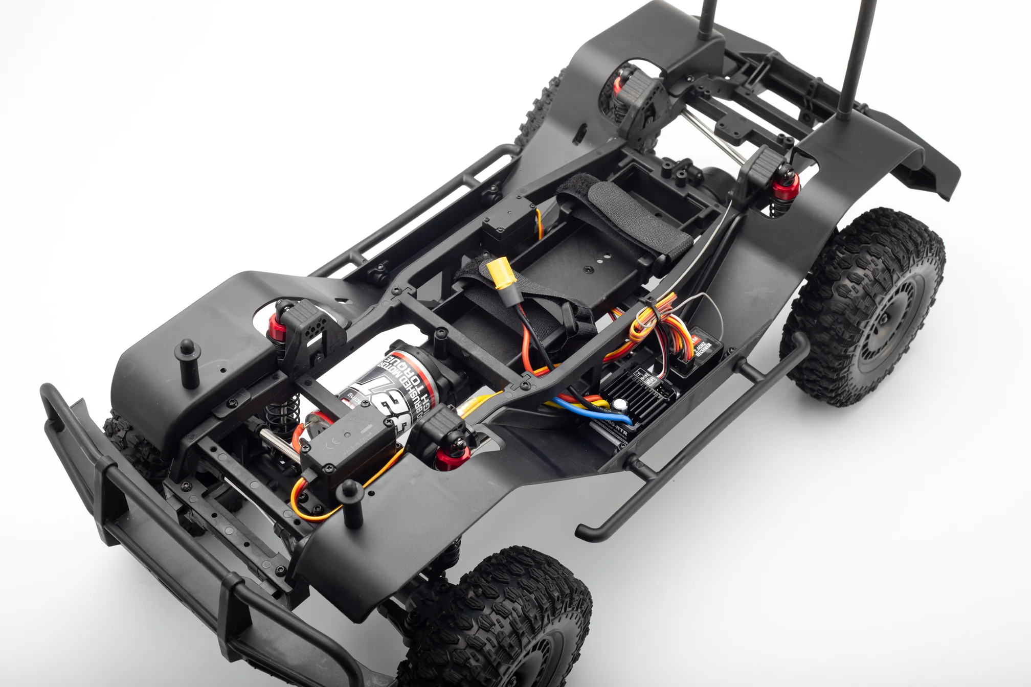 Remote-controlled two-speed transmission, switchable on-the- fly for both crawling and trail driving.