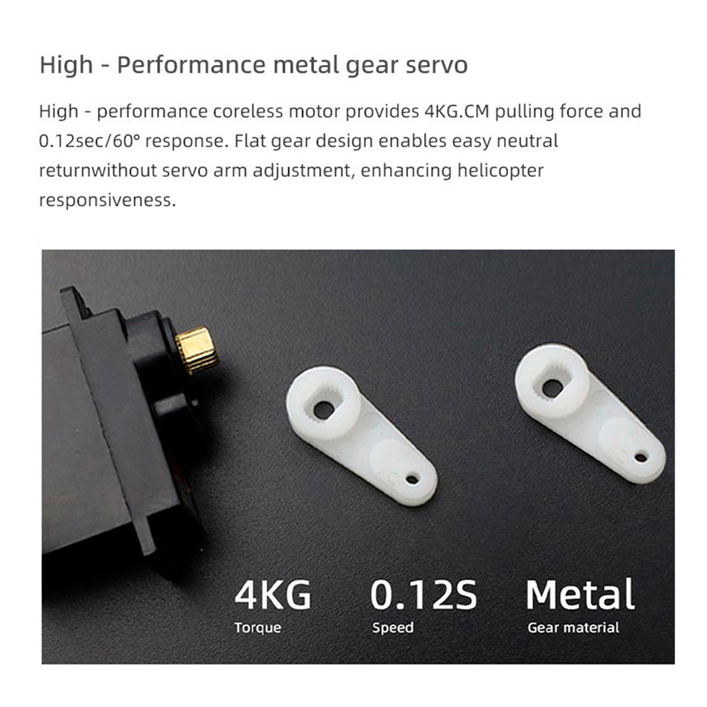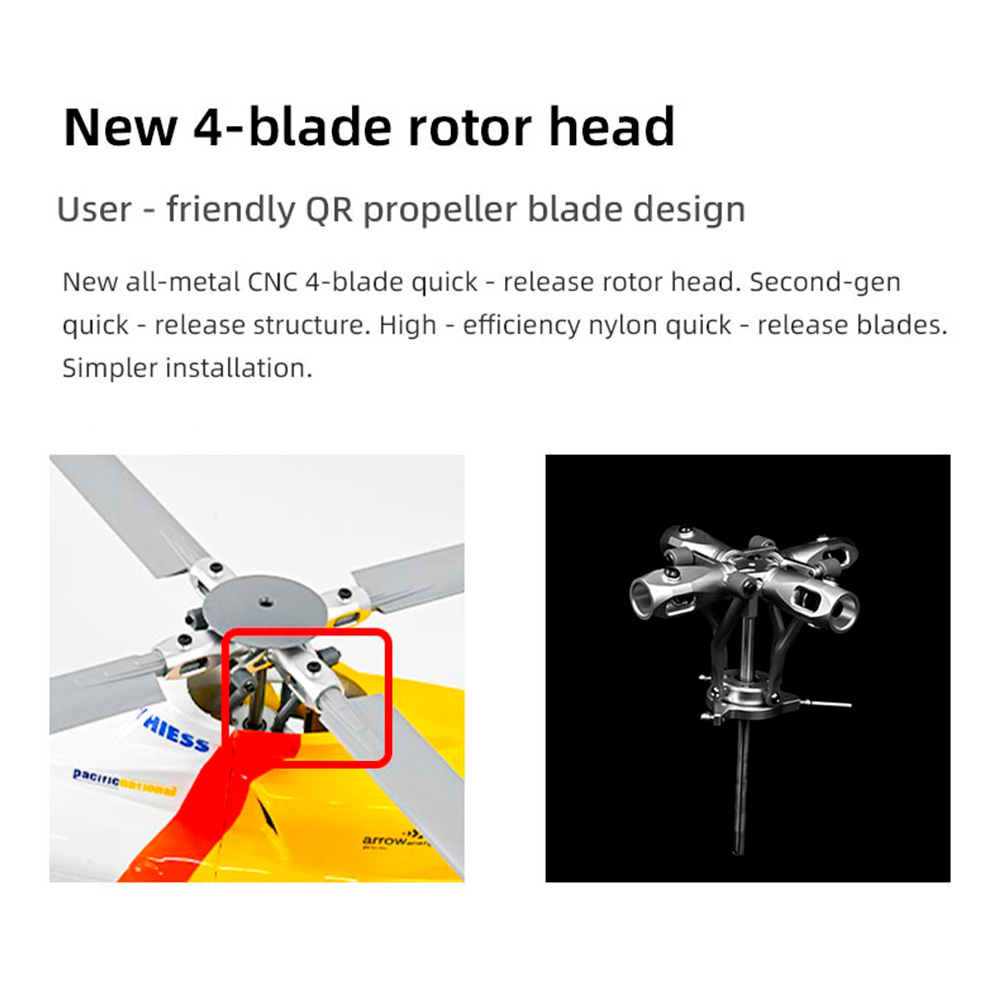 • Quick-detachable 4-blade FBL rotor head with reinforced swashplate for superior stability