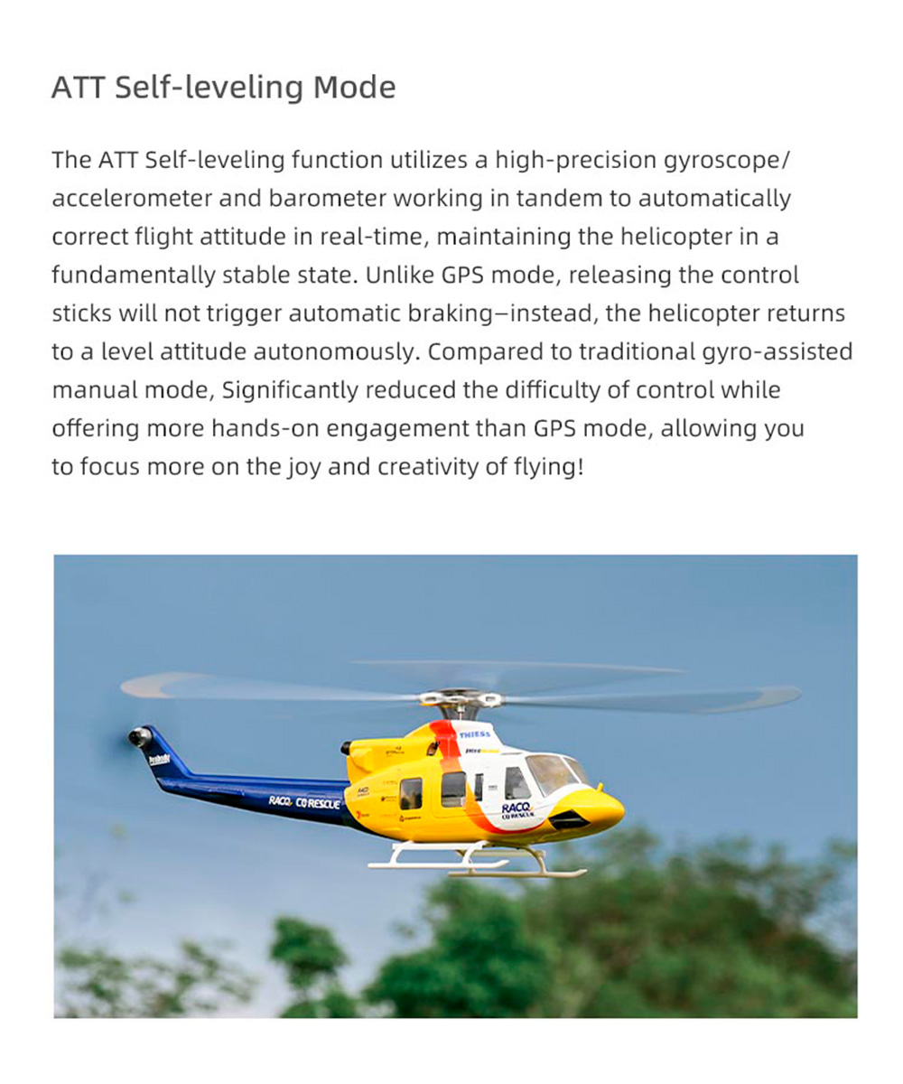 The FLYWING Bell-412 ACE is packed with advanced technology. At its core is the ACE flight control system, now upgraded with an M10 GPS chip for superior omnidirectional positioning. This allows for "hands-off" hovering stability—simply push the stick to fly, and release it to stop. It also features a new ATT Self-leveling Mode, which uses a barometer and gyroscope to maintain altitude while offering more hands-on engagement than standard GPS modes. The system includes intelligent safety features such as One-Key Return, Low Battery Return, and semi-automatic figure-8 route flights.