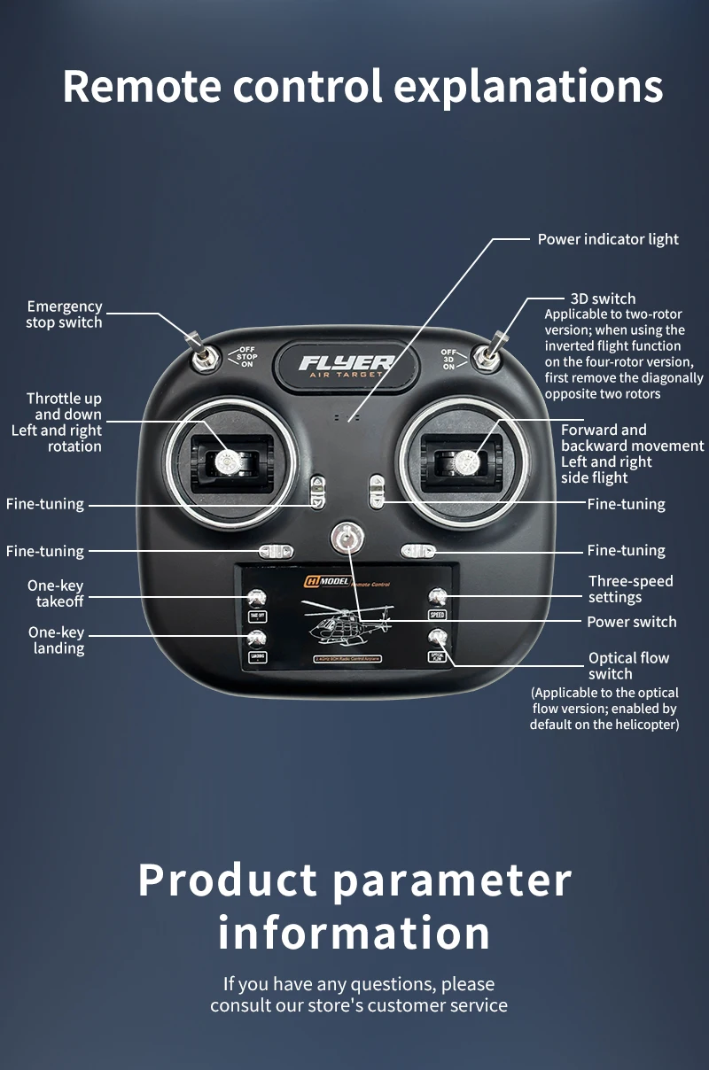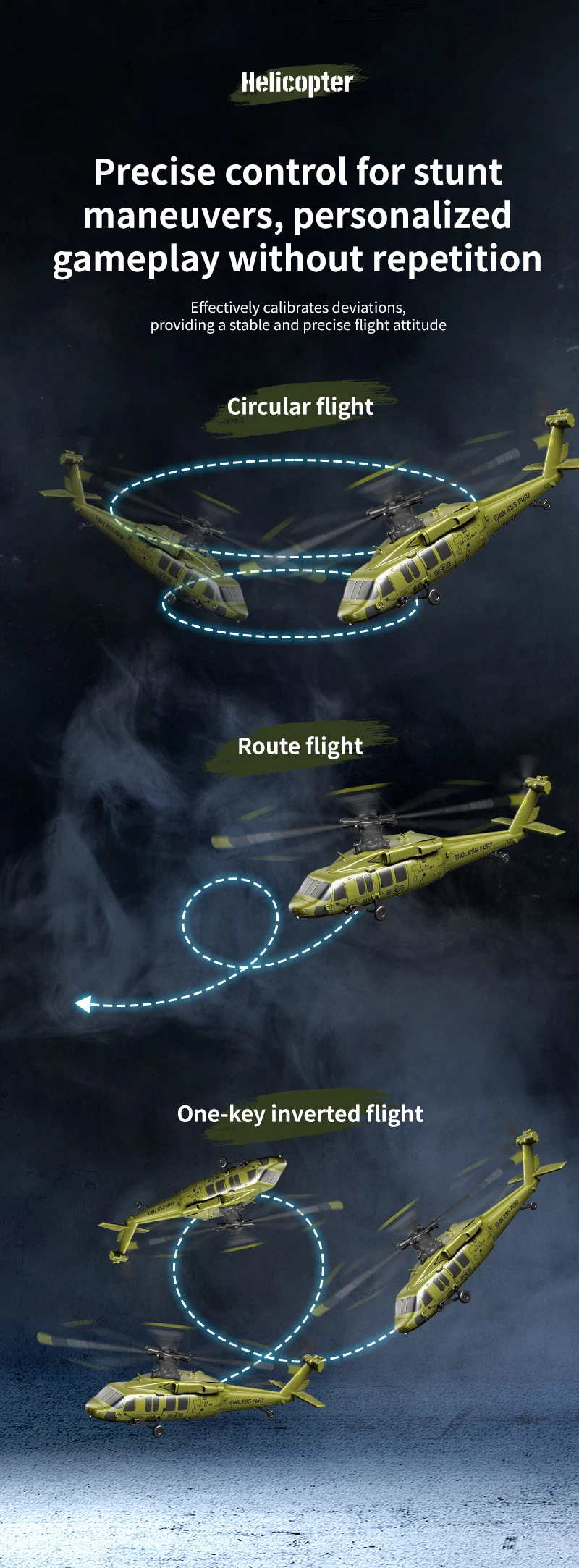- Ascents, descent, forward, backward, left and right flight, left and right rotation, and inverted flying