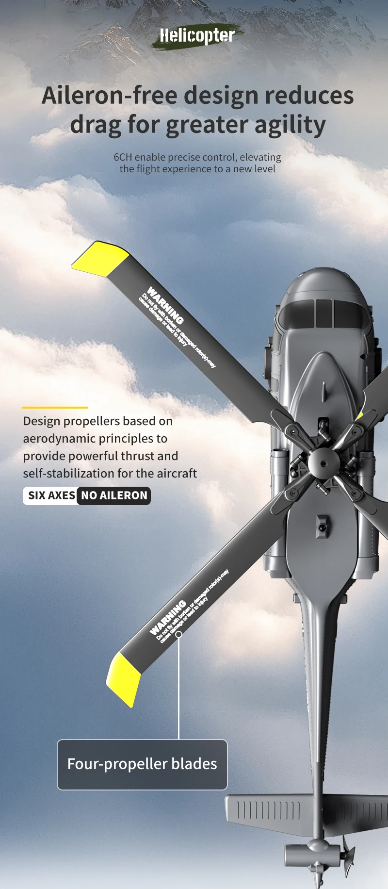 - 6-channel flybarless design with propellers designed based on aerodynamic principles providing greater flying capability and power
